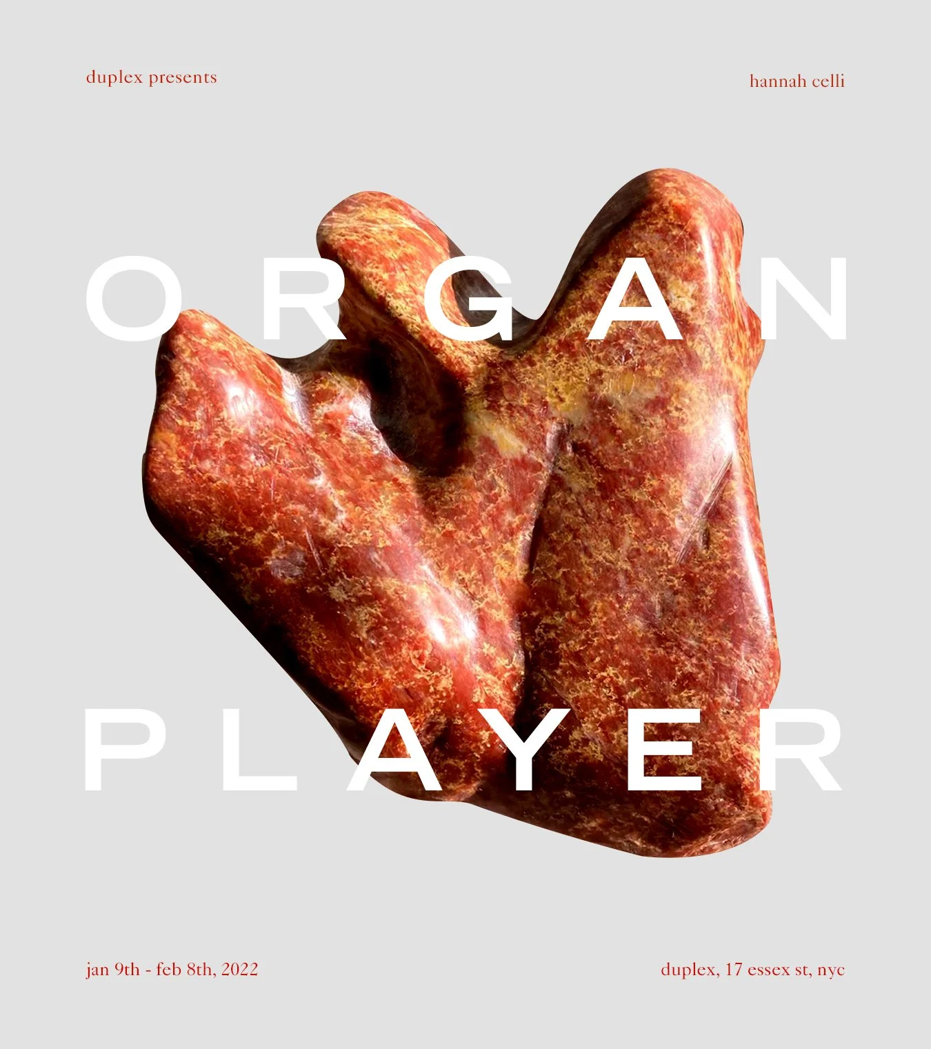 DUPLEX IS THRILLED TO PRESENT ORGAN PLAYER, HANNAH CELLI’S DEBUT SOLO SHOW. SINCE 2019, CELLI HAS STUDIED THE HEART BY CARVING DOZENS OF RED SOAPSTONES, MARBLE, AGATE, AND ALABASTER SOURCED FROM SOUTHWESTERN UTAH. EXPLORING SIMILARITIES BETWEEN THE ORGAN AND THE STONE, SHE IDENTIFIES THREE SURFACE FRACTURES OR VARIATIONS OF COLOR IN THE ROCK—REPRESENTING THE THREE VALVES IN A HUMAN HEART—AND EXPOSES THE BODILY STRUCTURE USING A MALLET, HAMMER, CHISEL, AND 16 GRITS OF SANDPAPER.